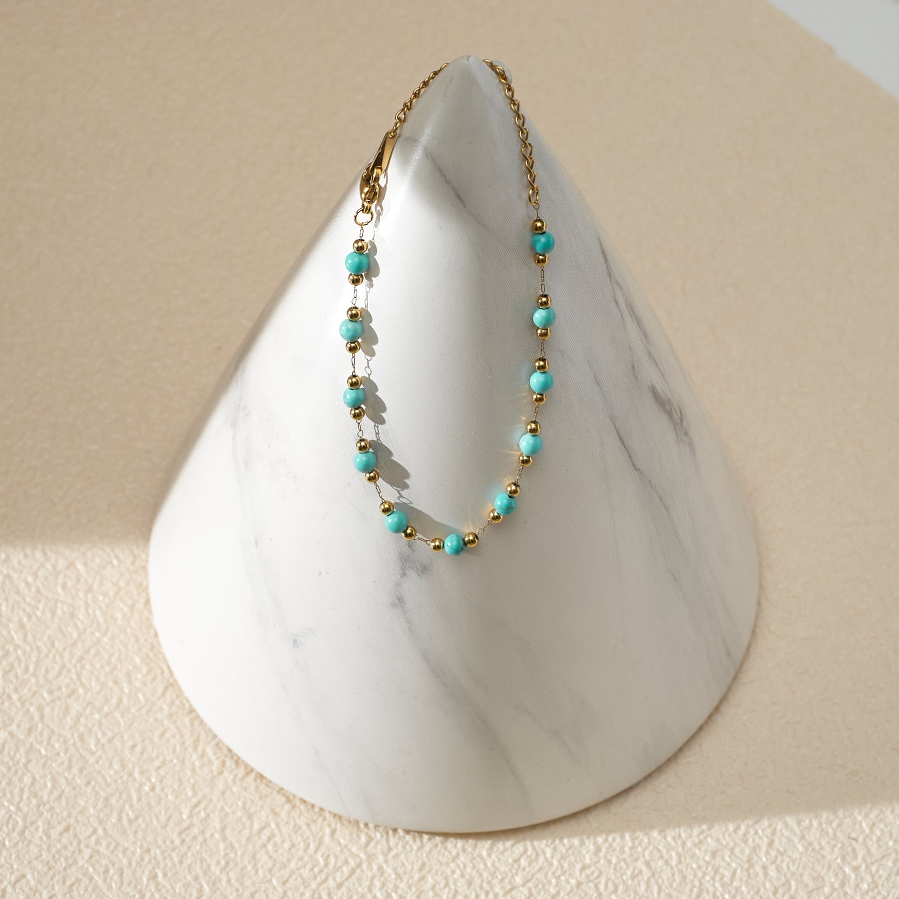 Escape to a tranquil paradise with the Turquoise Oasis Bracelet. This exquisite piece blends 18K gold plating, stainless steel, and vibrant turquoise to capture the essence of an oasis in the desert.