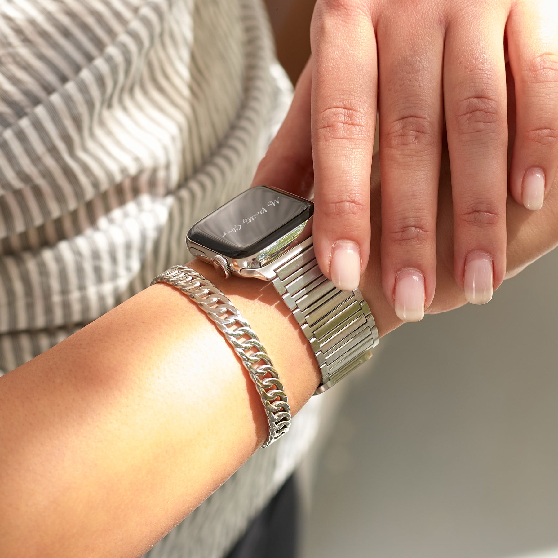 Crafted from premium stainless steel and twisted into elegant woven link chains, this watch band elevates your Apple Watch with its luxurious look & feel. Each watch band comes with its own metal adapter, designed to fit your Apple Watch seamlessly straight from the box.