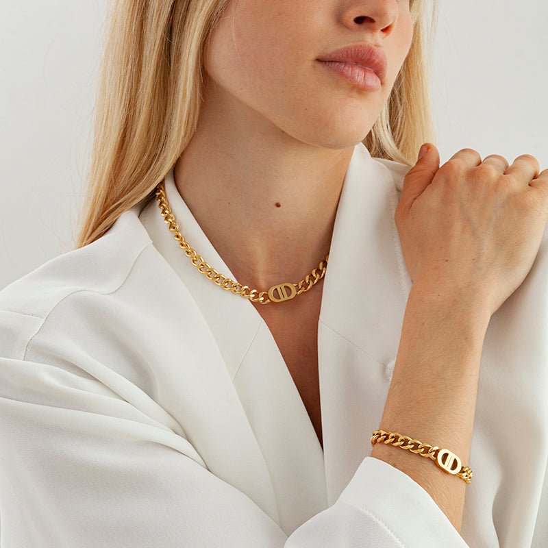 The Goddess Set contains a luxurious necklace and a stunning bracelet. Crafted with a blend of premium stainless steel and a thin layer of 18K Gold Plating that is both waterproof and allergy-friendly.